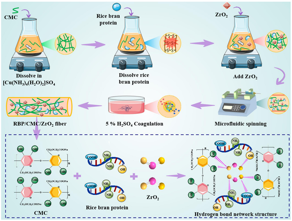 图1.RBP/CMC/ZrO2纤维的制备工艺及纤维的氢键网络结构。