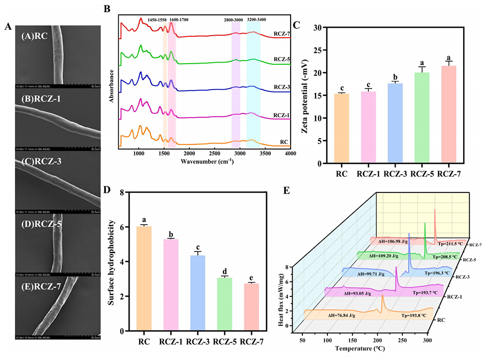 2、RBP、CMC和ZrO2 NPs的结合形成了强氢键网络,增强了纤维的热稳定性和结晶度,降低了表面疏水性,并使分子取向一致。