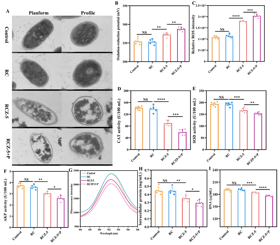 3、在可见光(300 W,12 h)催化下,纤维中的ZrO2 NPs产生活性氧,抑制枯草芽孢杆菌的抗氧化应激系统,破坏其生物膜和DNA,显示出优异的抗菌效果。