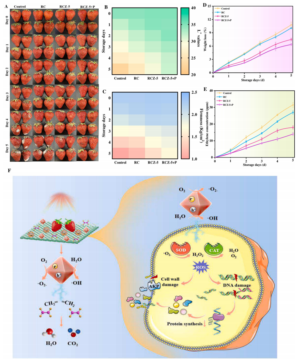 此外,光催化条件下,·OH能够持续攻击乙烯分子中的C=C双键,将其转化为甲醛、甲酸,最终转化为CO2和H2O,进一步清除乙烯。这种结合了物理吸附和光催化降解的机制,使得RBP/CMC/ZrO2纤维在草莓保鲜中表现出了优异的性能。