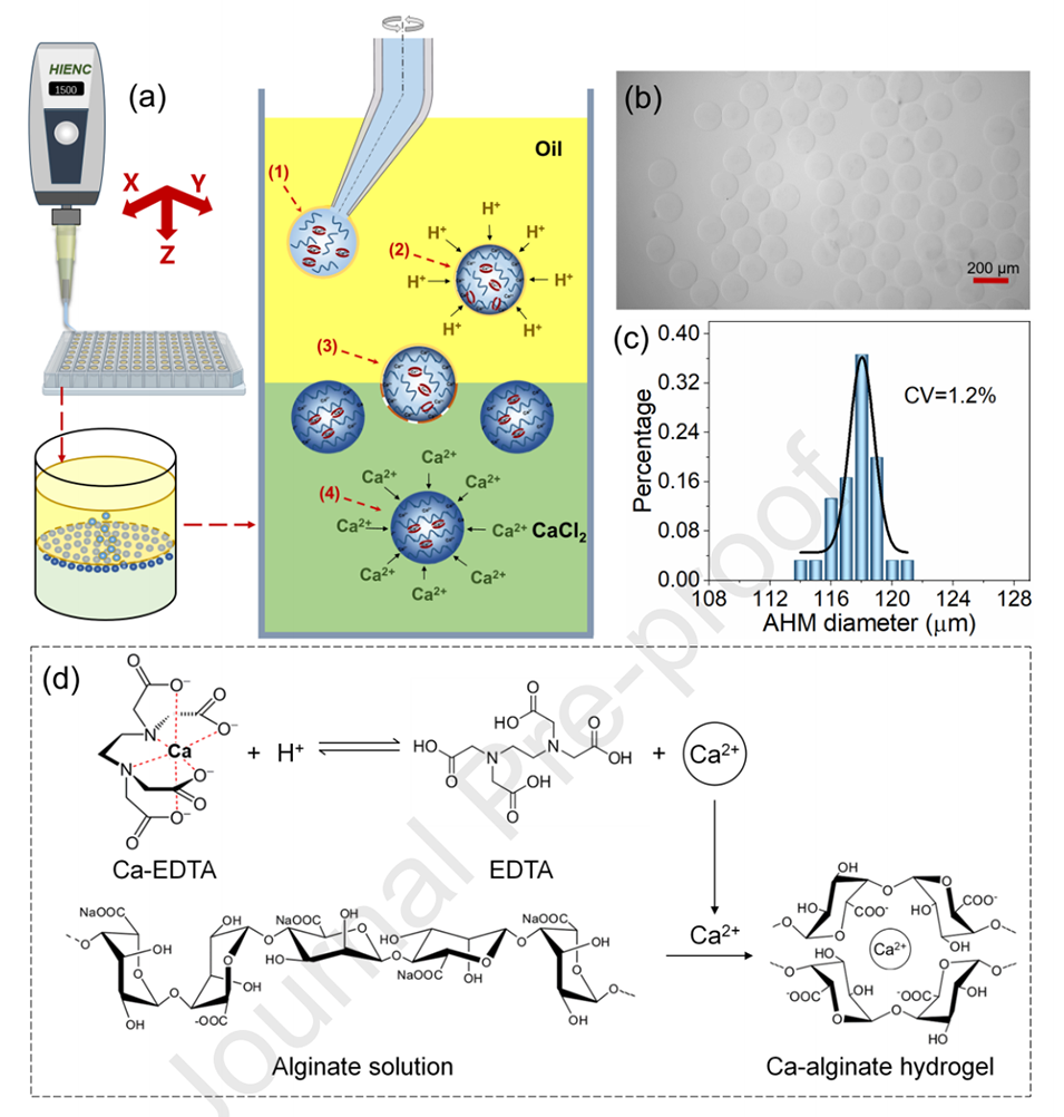 图1.(a)AHMs制备过程示意图,(1)乳化,(2)预凝胶化,(3)自发破乳,(4)固化。(b)单分散AHMs的典型照片(比例尺,200μm)。(c)图(b)中AHMs的尺寸分布分析。(d)Ca-EDTA复合物解离和海藻酸钙水凝胶交联的反应方案。在酸性条件下,Ca2+从液滴外层的Ca-EDTA复合物中释放出来,与藻酸盐链形成离子网络。在CaCl2浴中,Ca2+与藻酸盐链交联形成离子网络。