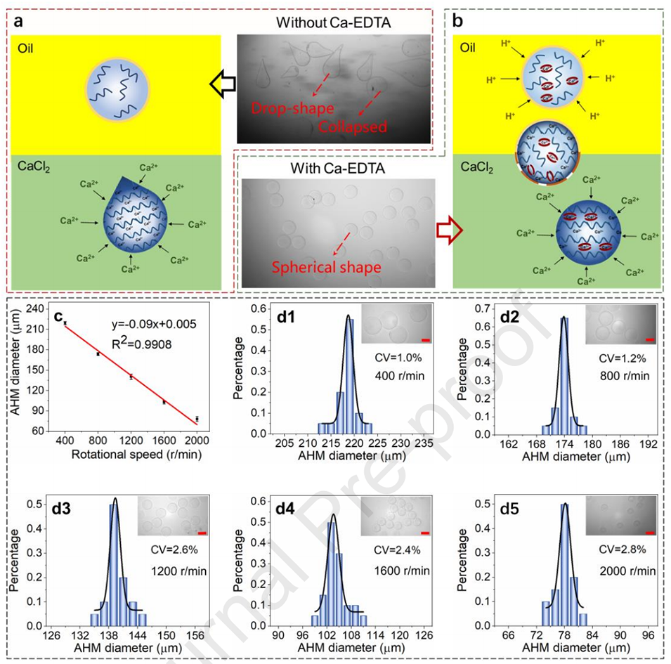 图2.(a)不含Ca-EDTA的藻酸盐液滴产生了滴状塌陷的AHMs。(b)含Ca-EDTA的藻酸盐液滴产生了球形AHMs。(c)AHMs的直径与转速呈线性关系。(d)(d1)400r/min、(d2)800r/min、(d3)1000r/min、(d4)1200r/min、(d5)1600r/min不同转速下生成的AHMs的尺寸分布分析(比例尺,100μm)。实验重复了三次。