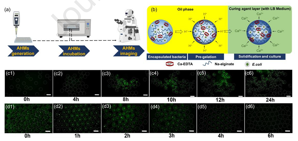 图3.(a)大肠杆菌MG1655包封AHMs的生成、培养和观察示意图。(b)大肠杆菌MG1655包封AHMs的生成原理示意图。(c1-c6)大肠杆菌MG1655在AHMs中生长的荧光照片。(d1-d6)大肠杆菌MG1655在液滴中生长的荧光照片。比例尺为200μm。
