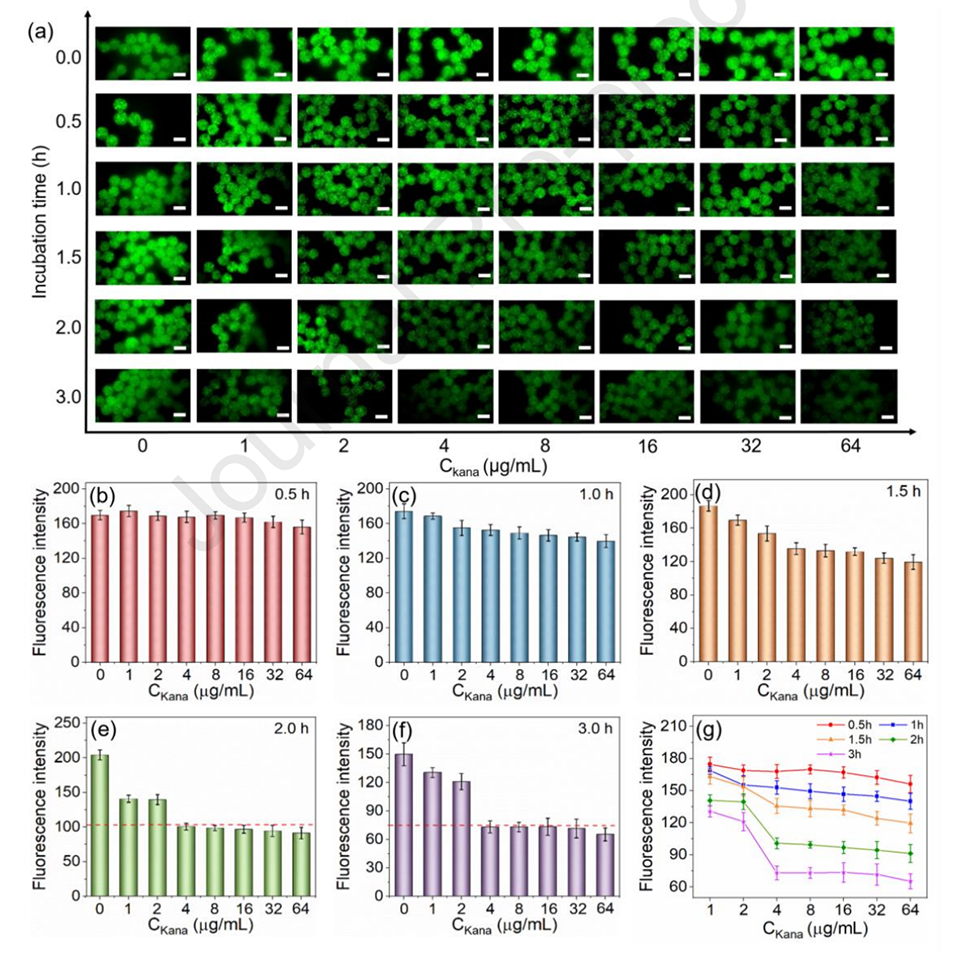 图4.基于AHMs的药物敏感性测试。(a)药物敏感性测试的典型荧光图像。(比例尺,100μm)。(b-f)(b)0.5h、(c)1h、(d)1.5h、(e)2h和(f)3h孵育后,不同卡那霉素浓度下AHMs的荧光强度。(g)3h孵育期间不同卡那霉素浓度下的药物敏感性测试曲线。
