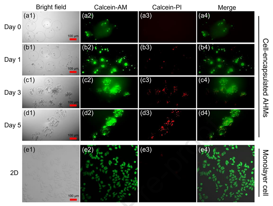 图6.(a-d)HeLa细胞包封AHMs在5天培养期间的典型亮场和荧光图像。(比例尺,100μm)(e)2D培养中HeLa细胞的典型亮场和荧光图像。(比例尺,100μm)。绿色荧光表示活细胞,红色荧光表示死细胞。