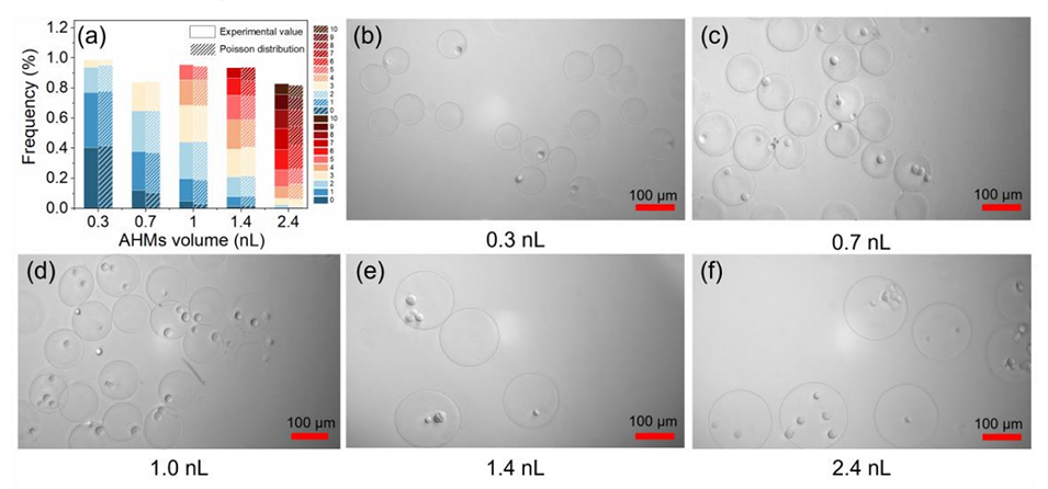 图5.(a)不同体积AHMs中细胞的包封率。(b-f)体积为(b)0.3nL、(c)0.7nL、(d)1.0nL、(e)1.4nL和(f)2.4nL的细胞包封AHMs的典型照片。(比例尺,100μm)