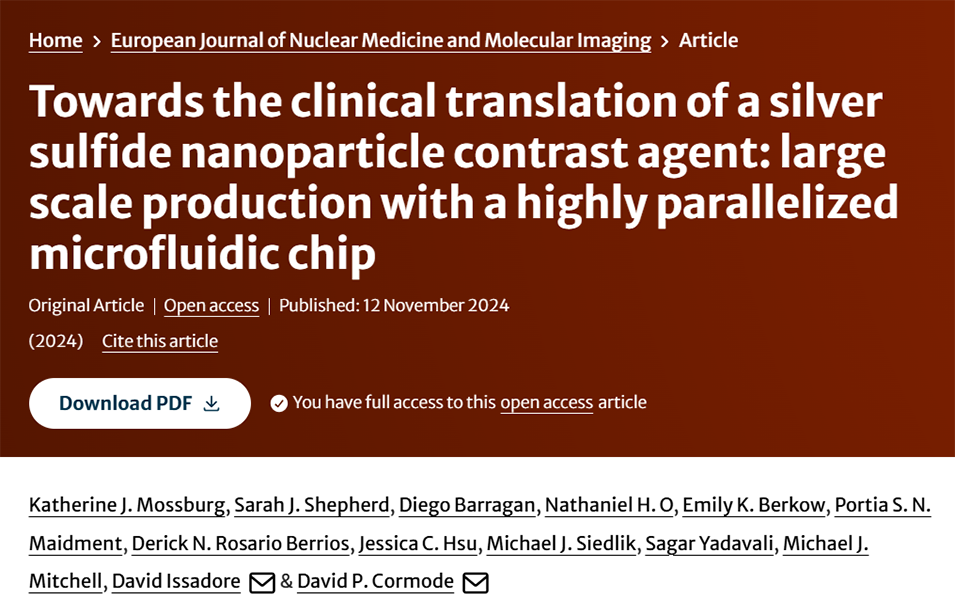 近期,有研究人员通过使用高度并行化的微流控芯片,成功实现了超小型硫化银纳米颗粒的大规模合成,并验证了其在体内外的成像对比度和清除特性,为临床转化奠定了基础。相关研究以“Towards the clinical translation of a silver sulfide nanoparticle contrast agent: large scale production with a highly parallelized microfluidic chip”为题目,发表在期刊《European Journal of Nuclear Medicine and Molecular Imaging》上。