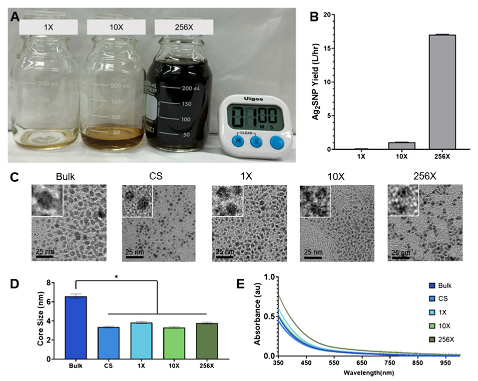 图2.A)运行一分钟后,使用每种SSMS芯片产生的Ag2S-NP的代表性图像,以及B)使用每个设备的生产率(平均值±SEM)。合成的Ag2S-NP的表征,包括C)具有代表性的TEM显微照片,插图显示4倍放大,D)核尺寸测量(平均值±SEM),以及E)紫外-可见光谱