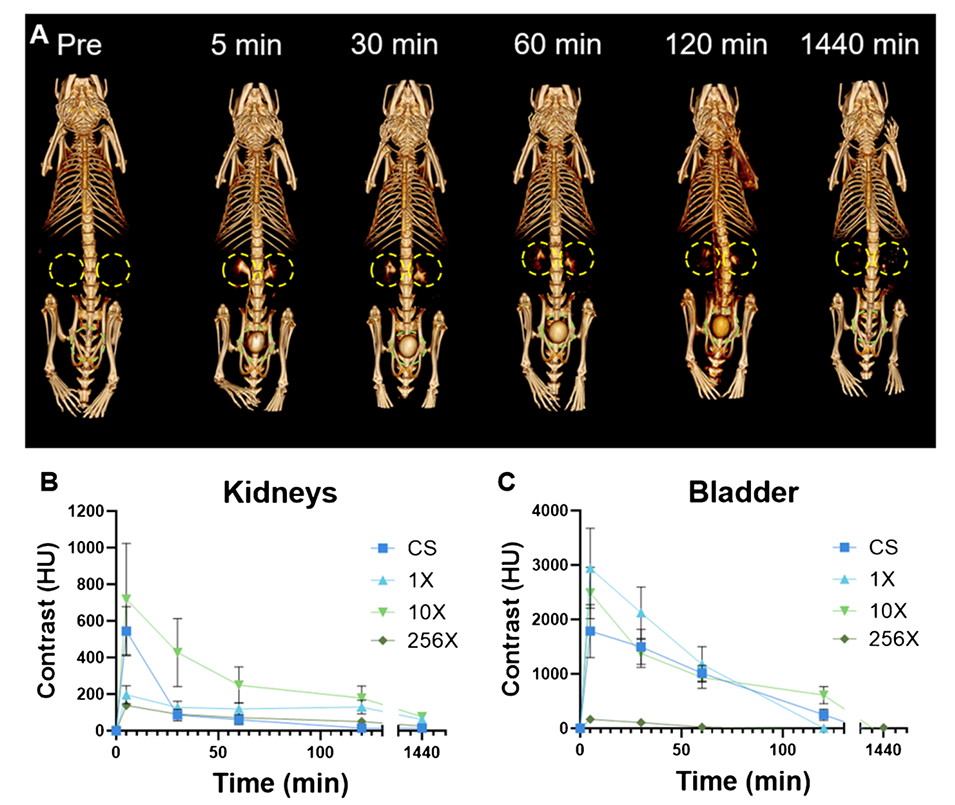 图5.A)3D微CT图像显示10X-Ag2S-NP正在被肾脏清除。图像包括注射前以及注射后5分钟、30分钟、60分钟、120分钟和1440分钟的情况。肾脏用黄色标记表示,膀胱用绿色标记表示。B) 肾脏和C) 膀胱在每个时间点的CT衰减量化。每组n=5。数据以均值±标准误差(SEM)呈现。