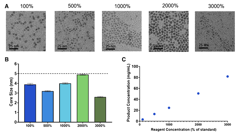 图3.用增加的浓度合成的Ag2S-NP的表征,包括A)代表性的TEM显微照片,B)核尺寸测量(平均值±SEM),以及C)通过ICP测量的产物浓度