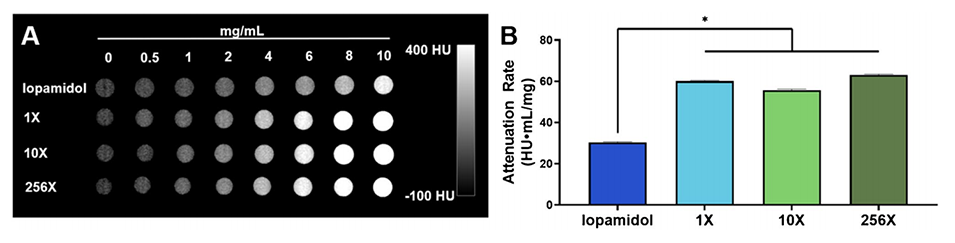 图4.体外CT成像。A)对浓度范围为0-10mg/mL的碘异酞醇、1X-Ag2S-NP、10X-Ag2S-NP、256X-Ag2S-NP进行代表性µCT扫描,并B)定量不同溶液的CT衰减率(平均值±标准差)