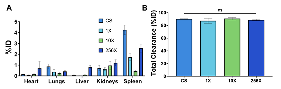 图6.A)注射后24小时Ag2S-NP在小鼠体内的生物分布(平均值±SEM)。每组n=5。B)24小时内小鼠Ag2S-NP的总清除率(平均值±SEM)