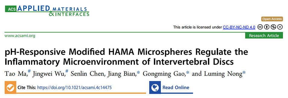 近期,南京医科大学附属常州第二人民医院骨科农鲁明、高共鸣等人采用微流控技术开发了一种pH响应性甲基丙烯酸酯化透明质酸(HAMA)微球,能够智能释放IL-1 Ra以调节椎间盘退行性变的炎症微环境,并通过体外和体内实验验证了其在促进椎间盘再生和抑制炎症中的潜力。相关研究以“pH-Responsive Modified HAMA Microspheres Regulate the Inflammatory Microenvironment of Intervertebral Discs”为题目,发表在期刊《ACS Applied Materials & Interfaces》上。