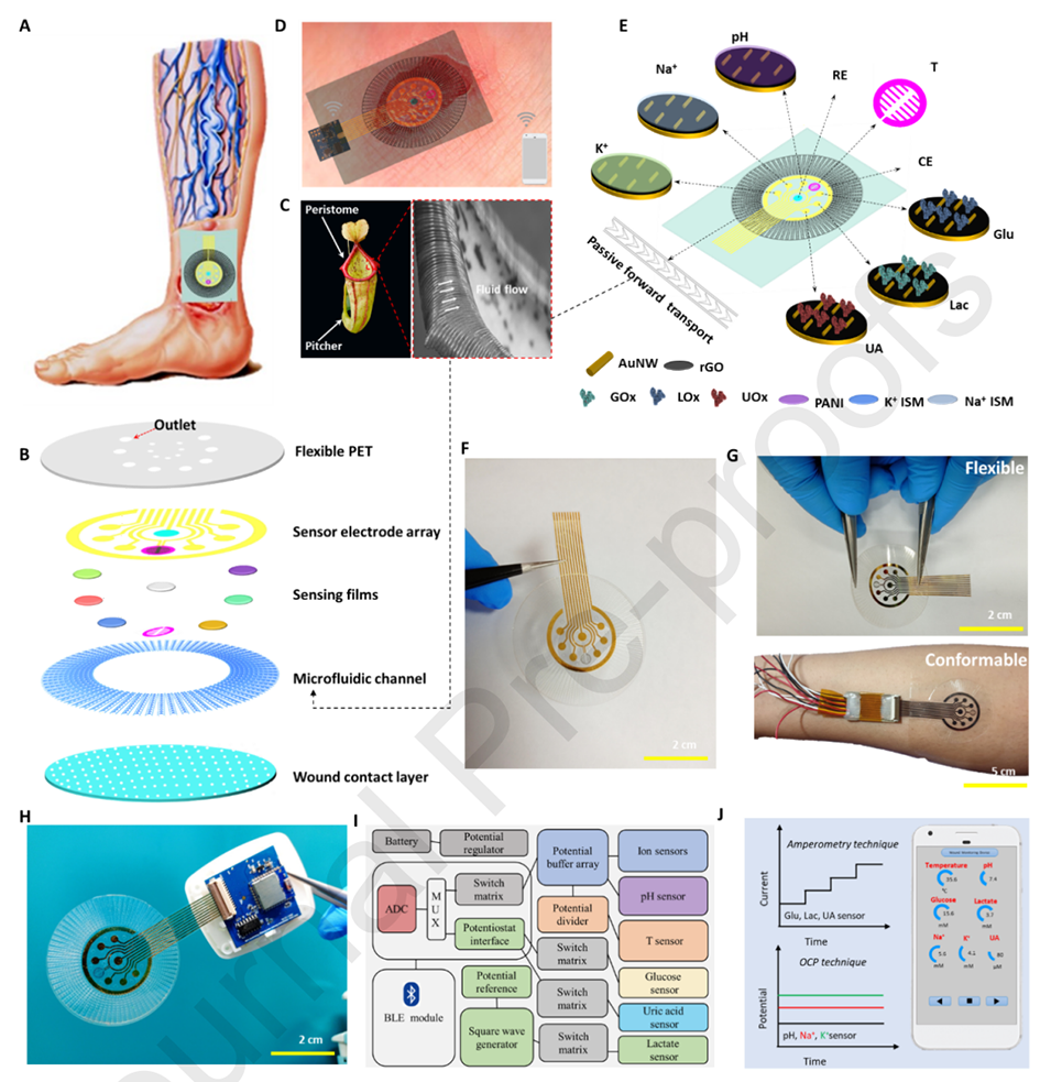 1、本研究提出了一种集成微流体通道的柔性多模态生物传感贴片,用于监测与慢性伤口相关的理化参数,旨在实现个性化伤口管理。