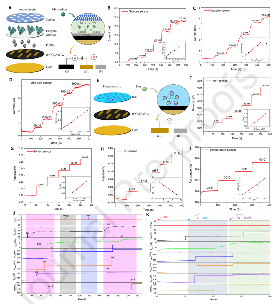 4、传感平台采用掺金纳米线的还原氧化石墨烯复合材料进行功能化,以制造电化学生物传感器阵列,能够同时检测多种代谢物(如葡萄糖、乳酸和尿酸)、离子(Na+和K+)、pH值和温度。