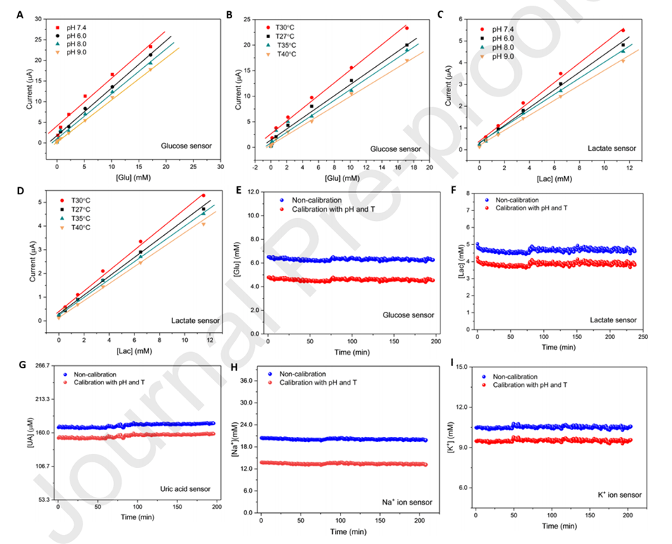 5、使用pH和温度补偿算法校准传感器响应,以准确量化分析物浓度,并在大鼠伤口模型中评估其多重传感能力。