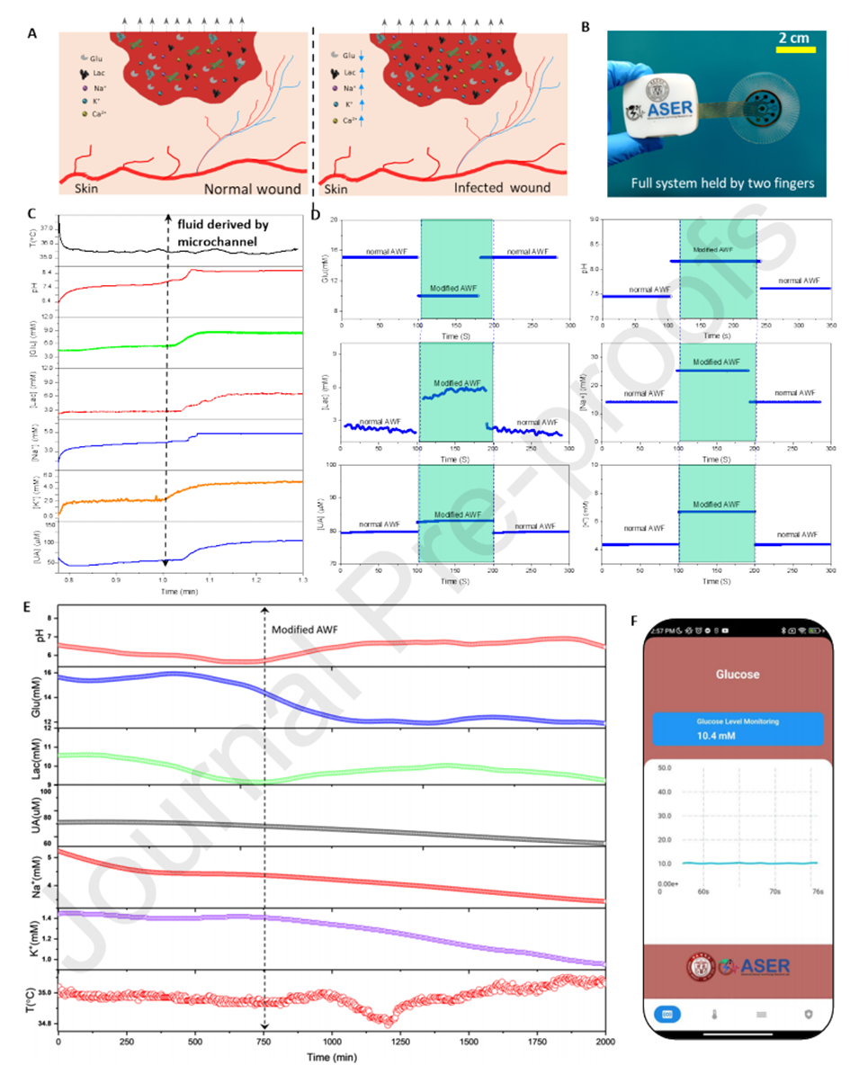 慢性伤口感染是一个严重的健康问题,全球超过1300万人面临糖尿病溃疡、静脉溃疡和手术伤口等慢性难愈合创面的困扰。这些伤口的愈合过程受到有害微生物的影响,可能导致组织坏死和严重并发症。伤口渗出液的动态成分反映了愈合阶段和潜在感染的生理化学特征,例如温度升高通常与细菌定植相关,而pH值的变化则指示着伤口的炎症状态和修复过程。实时监测这些生理化学参数对于改善慢性伤口的管理至关重要,但现有的可穿戴生物传感器在多参数监测方面仍面临挑战。