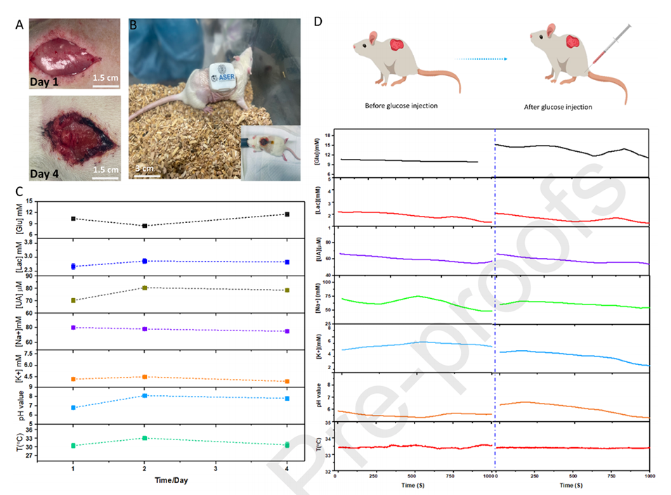 图7.在糖尿病大鼠模型中使用可穿戴贴片进行多重伤口生物标志物监测的体内评估。