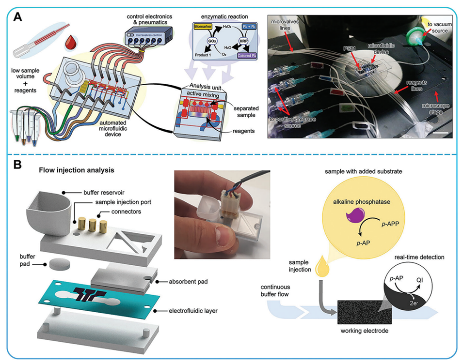 图2.A)基于微芯片的微流控用于自动化生物标志物分析的示意图和实物图。B)μPAD用于血清碱性磷酸酶分析。