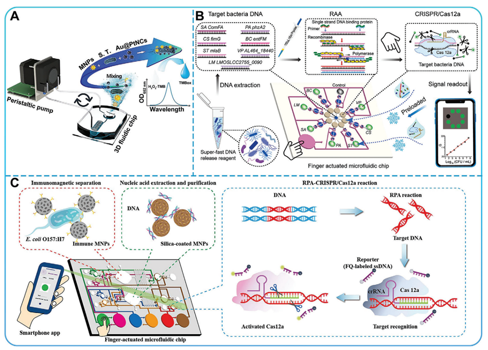 图3.A)用于细菌检测的光学生物传感器示意图。B)描述在FA-MB上使用一锅式RAA-CRISPR/Cas12a测定进行多重检测的示意图。C)全集成FA微流控生物传感器示意图。