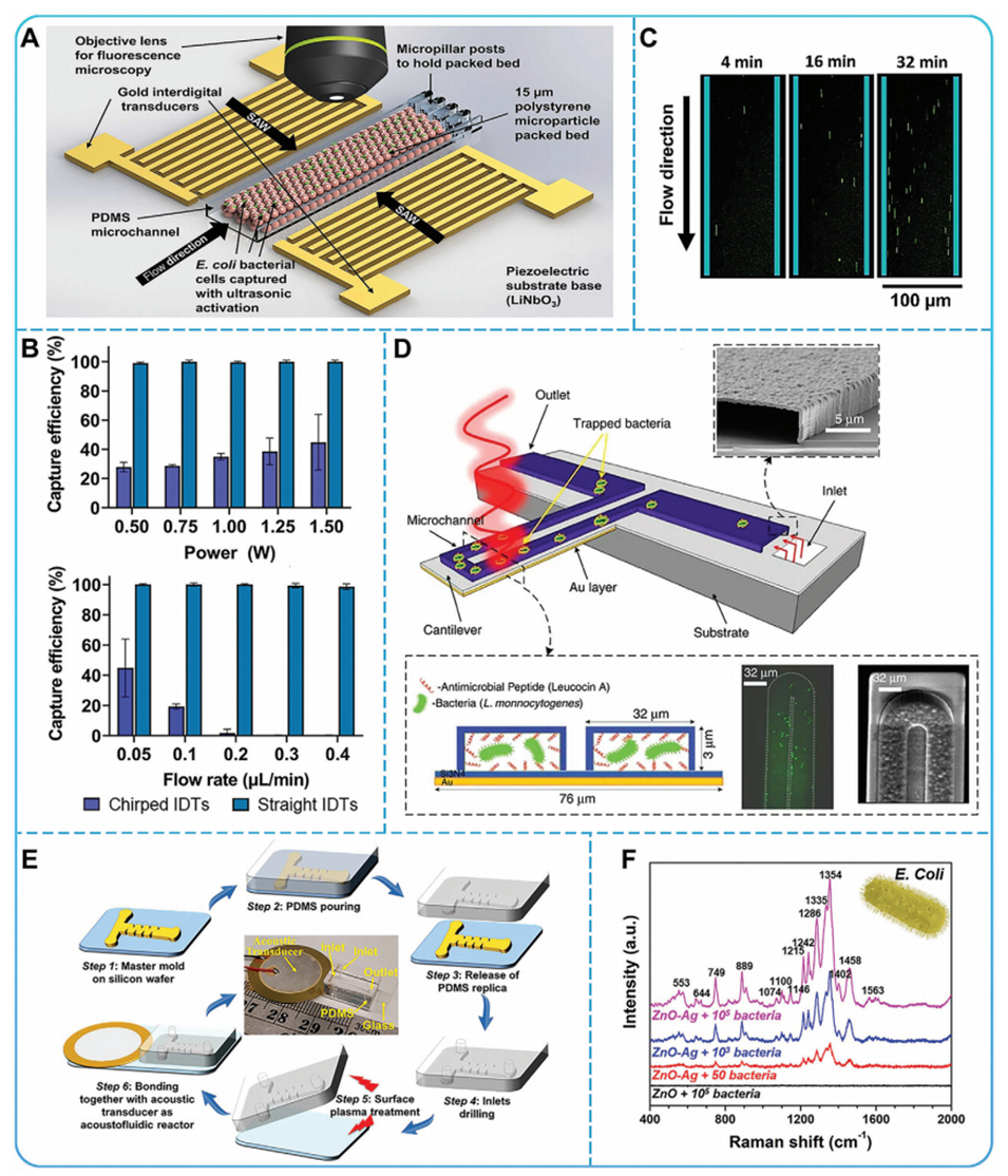 图4.A)设备概述。B)功率和流速与捕获效率的关系。C)释放细胞的荧光成像。D)使用BMC传感器系统捕获和检测细菌。E)基于声流体器件的具有锐边结构的3D ZnO纳米阵列示意图。F)不同浓度大肠杆菌的SERS光谱。