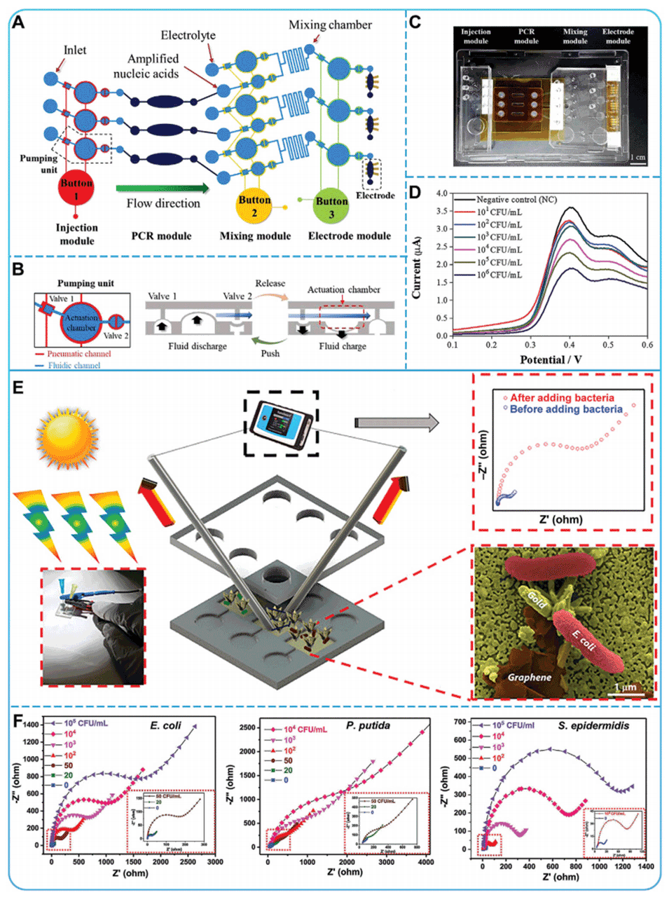 图6.A)无泵微流控芯片的示意图,B)工作原理,和C)实物图。D)使用集成无泵微流控芯片检测不同浓度大肠杆菌O157:H7的电化学信号。E)利用3D金纳米结构集成3D Gold NMIs/Gr的等离子体辅助阻抗微流控设备的示意图。D)不同浓度大肠杆菌、恶臭假单胞菌和表皮葡萄球菌的EIS结果。