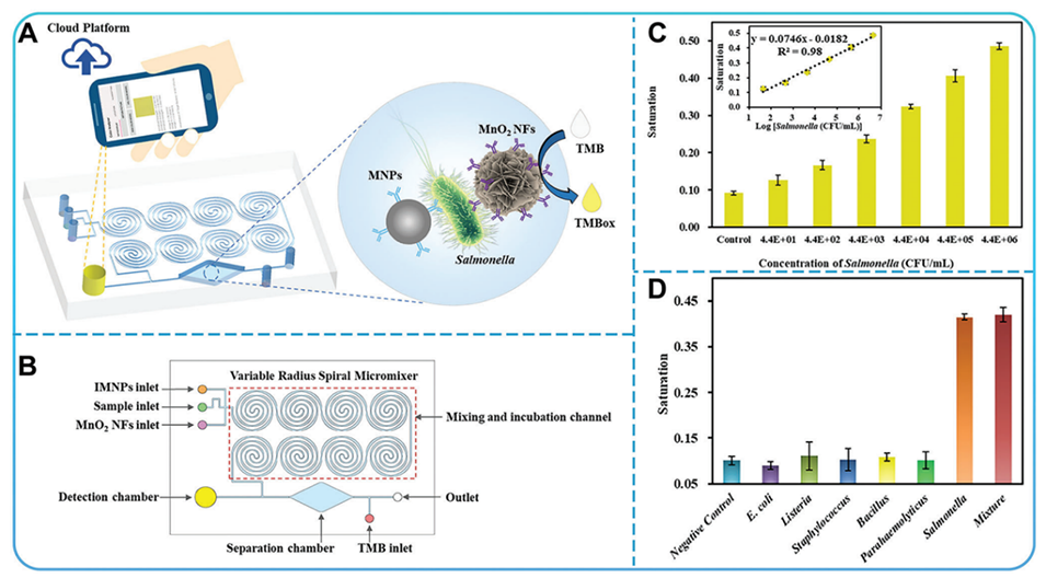 图5.A,B)用于沙门氏菌检测的比色生物传感器的图示。C)该生物传感器的校准曲线和D)特异性。