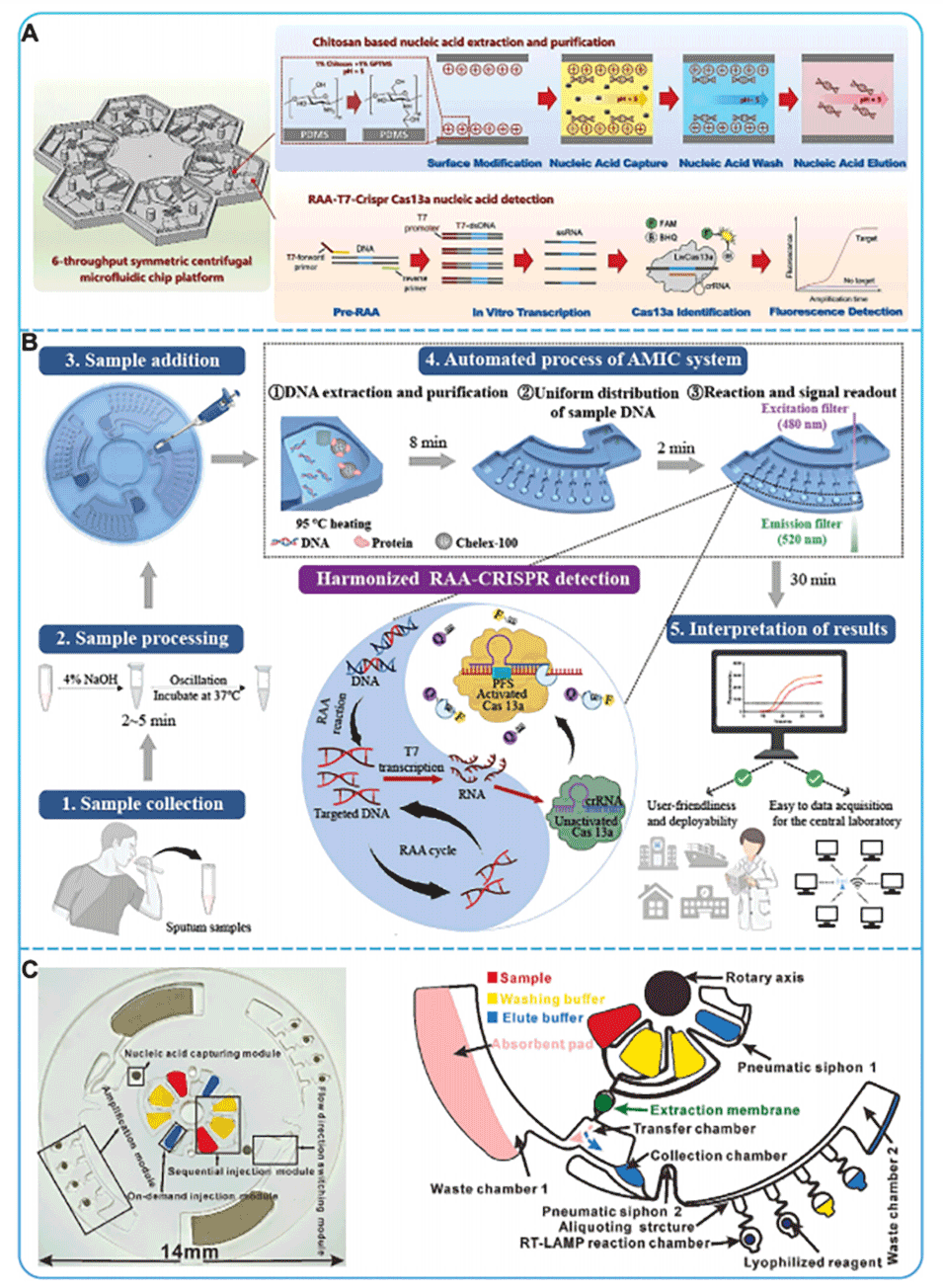 图7.A)用于细菌检测的离心式微流控芯片。B)全自动诊断系统的工作流程。C)芯片的物理和详细表示。