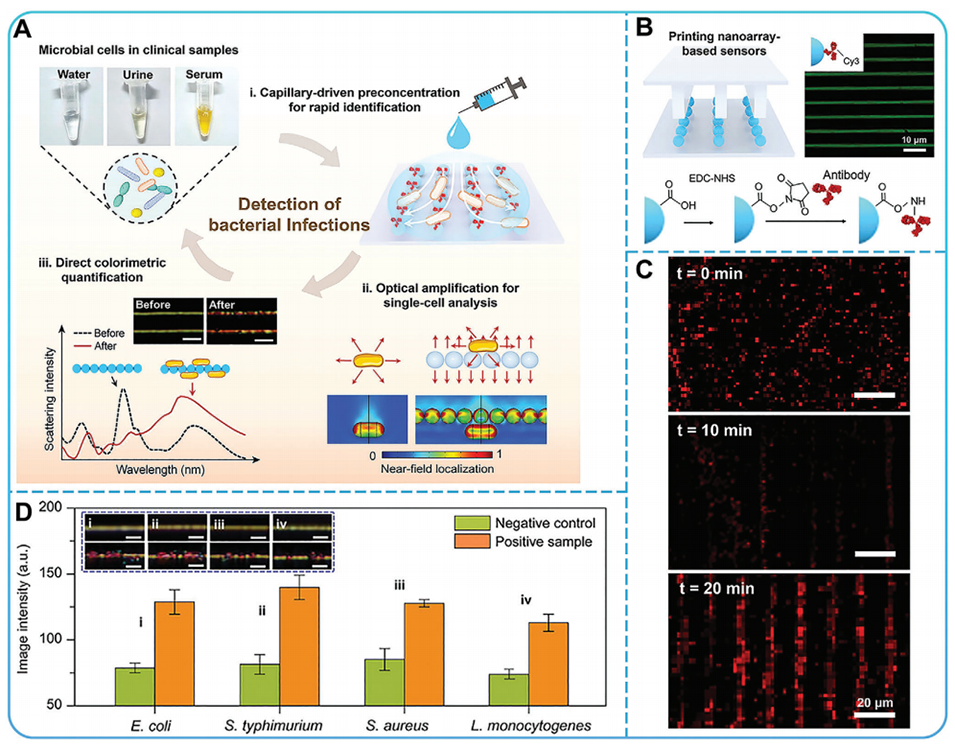 图8.A)描述微生物细胞检测的示意图。B)构建生物传感器的过程。C)显示捕获目标细菌的实时荧光图像。D)四种不同细菌样本的颜色强度变化。