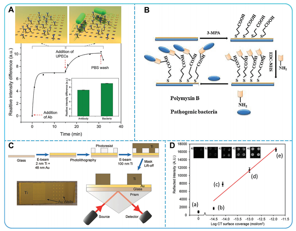 图9.A)实时尿路致病性大肠杆菌检测试验。B)LSCI-SPR传感器芯片修饰示意图。C)用于SPRi的Au-well阵列的制造过程示意图。D)共轭纳米颗粒放大后反射率与CT表面覆盖率的关系图。