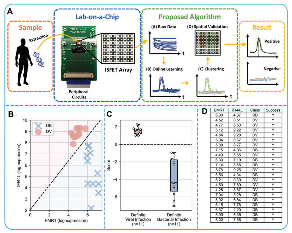 图10.A)使用构建的算法从样本到结果的工作流程。B)散点图、C)箱线图和D)表格显示了病毒与细菌分类的对数微阵列表达值。