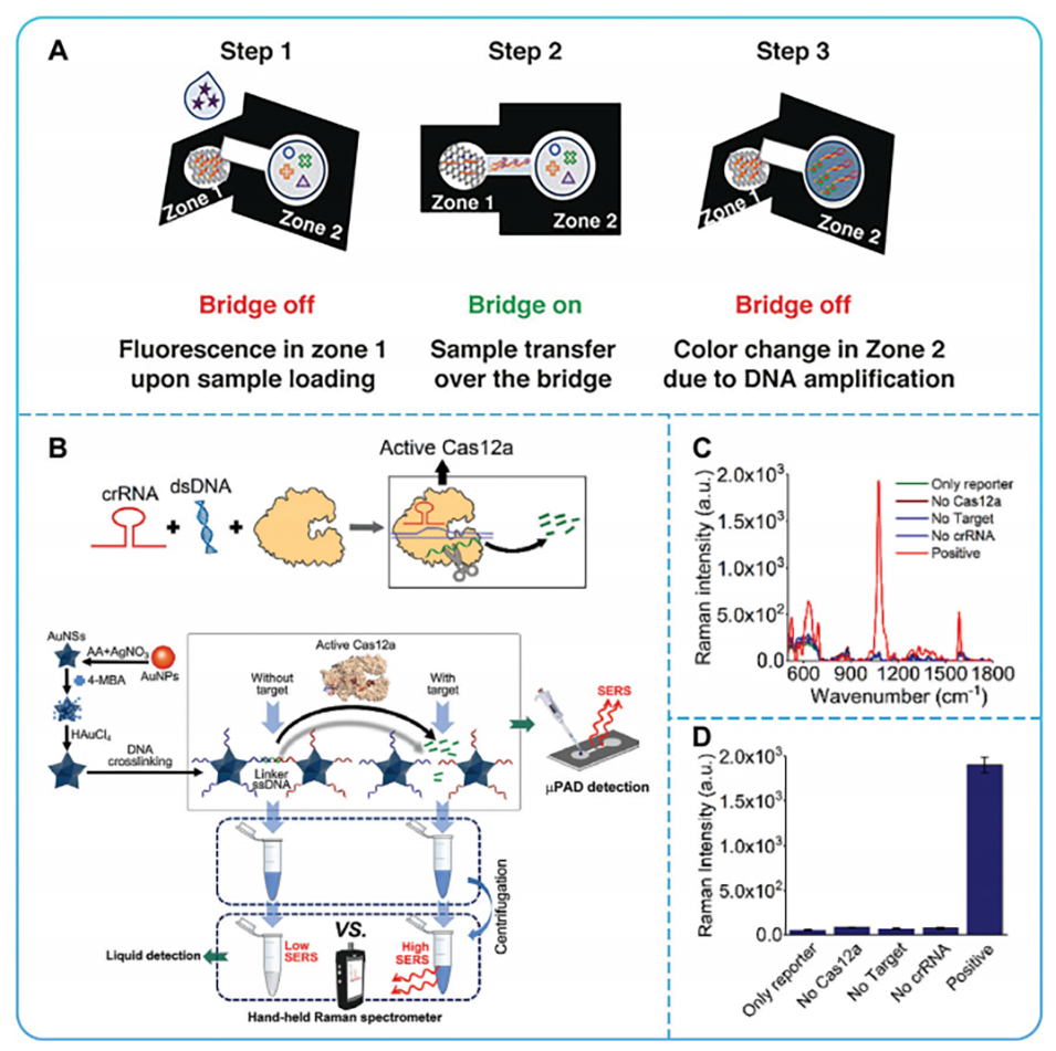 图13.A)带有比色信号的纸基适体传感器平台。B)CRISPR/Cas12a的激活。RPA-Cas12a-μPAD中SERS信号的拉曼光谱(C)和直方图(D)。