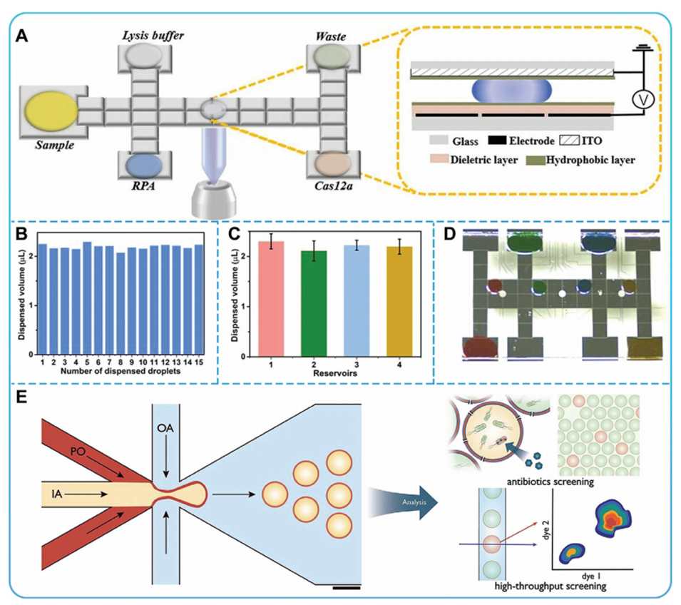 图11.A)DMF-Cas12a方法示意图。B-D)DMF(数字微流控)芯片上的液滴处理性能。E)利用微流体六通接头和高通量GUV分析生成双乳液的示意图。