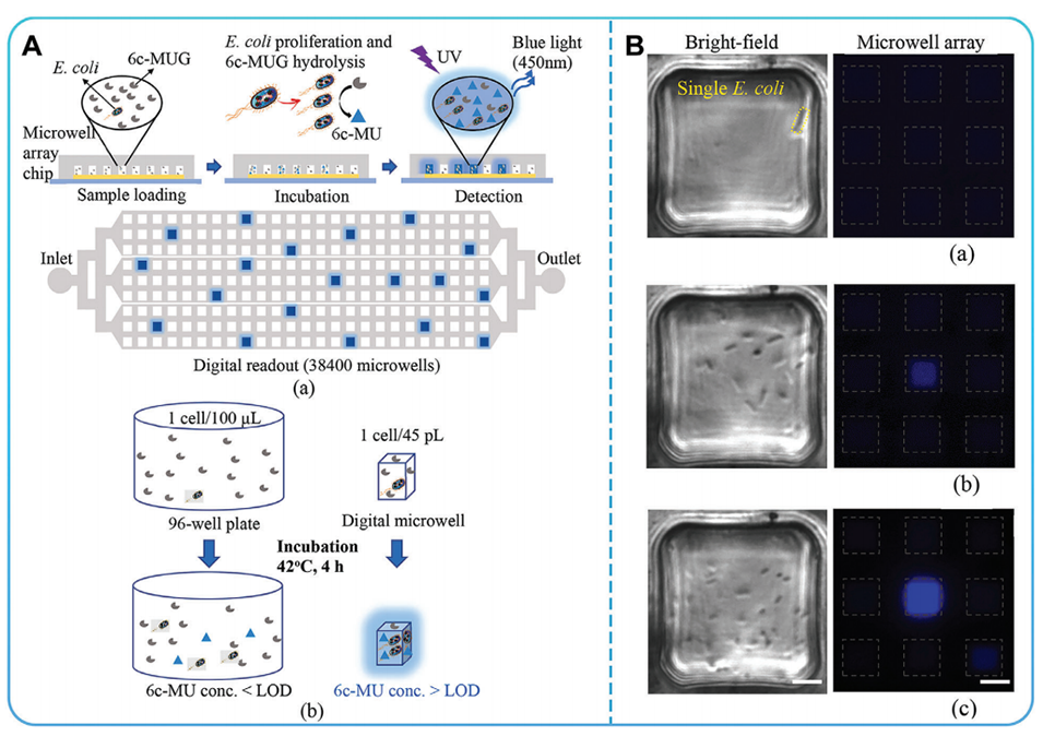 图12.A)使用芯片检测单个大肠杆菌。B)单个大肠杆菌生长的明场和荧光监测。