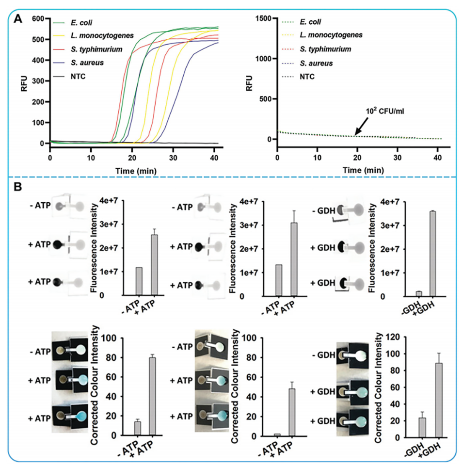 图15.A)病原体的多重检测。B)双响应纸传感器的性能评估。