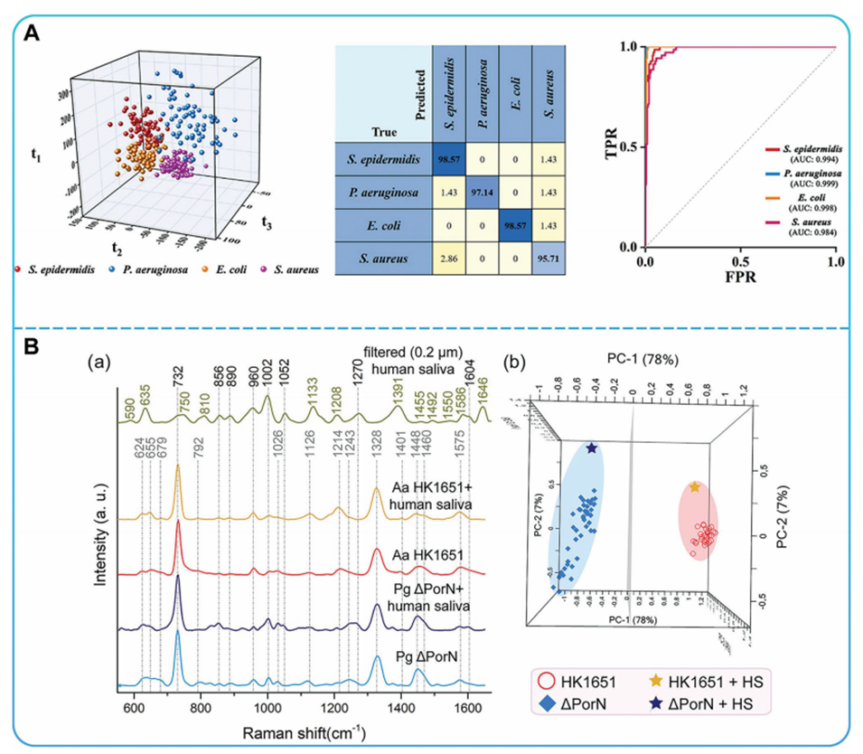 图16.A)用微流体系统检测泪液中的细菌。B)细菌菌株的SERS光谱和PCA结果。