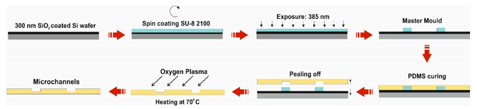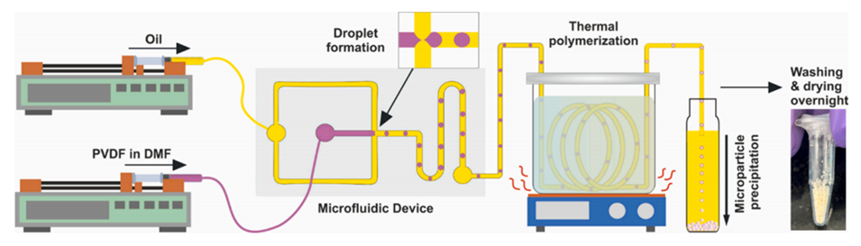 图3.使用芯片外热聚合技术在微流体装置中加工PVDF微粒的示意图。