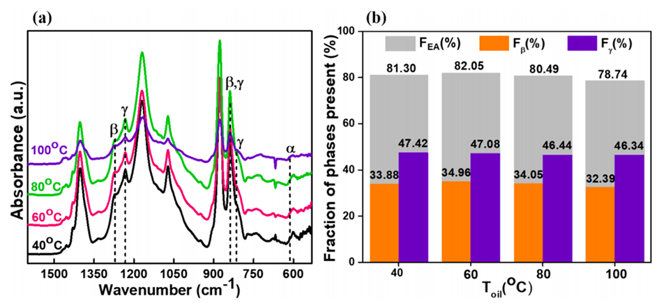 图8.(a)波数区间为1600-400cm-1的FTIR光谱,(b)条形图显示了在40°C、60°C、80°C和100°C的Toil条件下加工的PVDF微球的EA、β和ɣ相的比例,Qc-Qd为100-5µL/min。