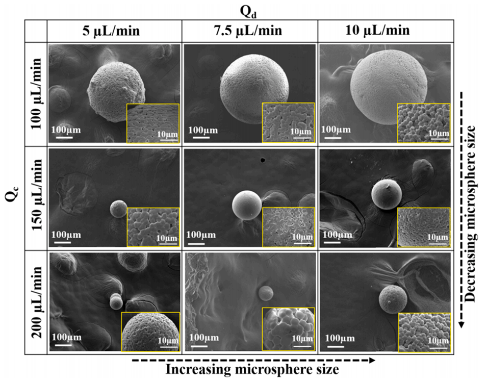图4.FE-SEM图像显示了不同Qc(连续介质的流速)-Qd(非连续介质的流速)值的PVDF微球。插图展示了微球表面的放大视图。