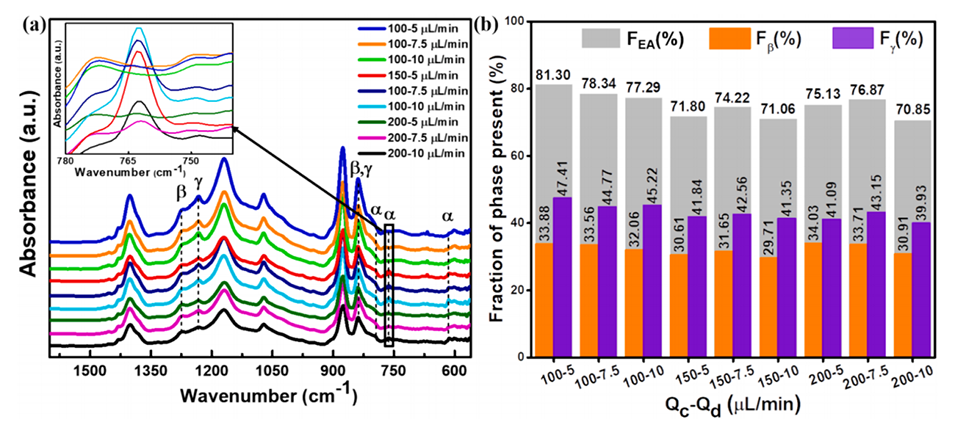 图6.(a)波数区间为1600–400 cm-1的傅里叶变换红外光谱,插图显示了波数区间为780–740 cm-1的重叠光谱,(b)条形图显示了在不同Qc-Qd值和Toil=40°C下加工的PVDF微球的EA、β和ɣ相的量化分数。