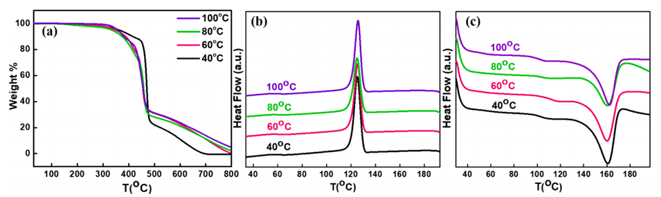 图9.(a)TGA热分析图和(b)DSC热分析图展示了在40°C、60°C、80°C和100°C的Toil条件下加工的PVDF微球的冷却和(c)熔融循环。