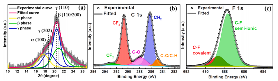 图10.(a)编号为100-5-60的样品的XRD光谱及其曲线解卷积,(b)F 1s和(c)C 1s的解卷积XPS高分辨率光谱。