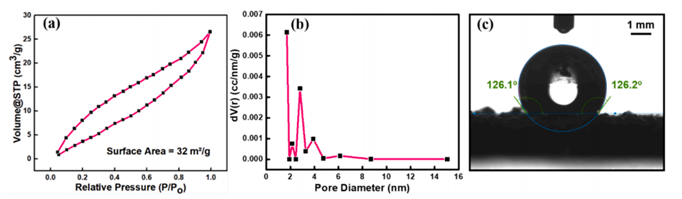 图11.(a)样品100-5-60的氮气吸附/解吸等温线,(b)BJH孔径分布图和(c)接触角测量。