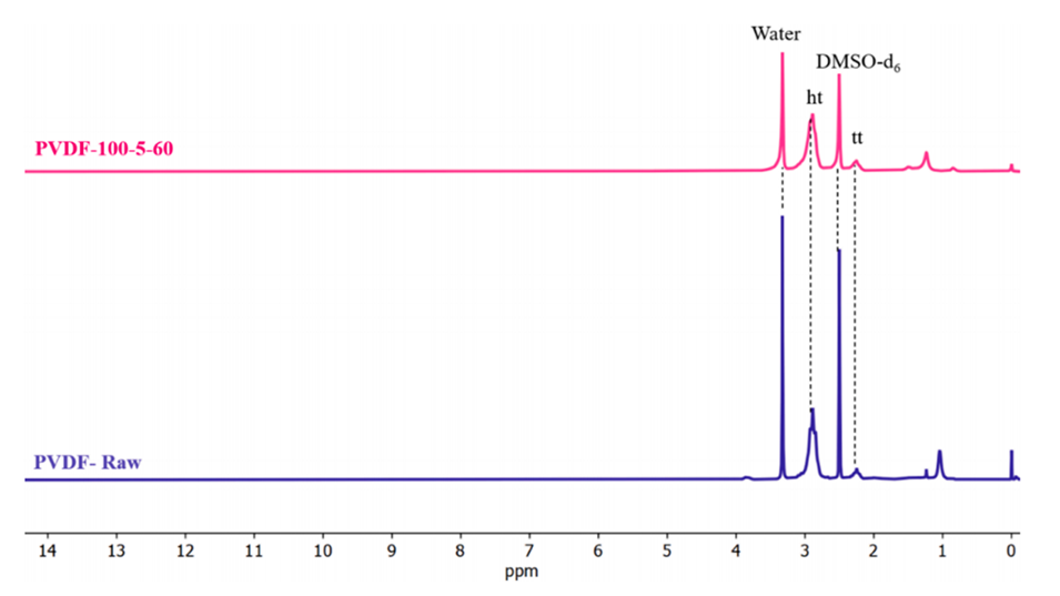 图13.PVDF原料和PVDF-100-5-60的1H NMR光谱比较。
