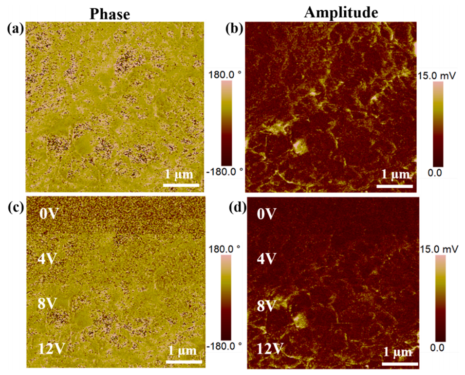 图16.编号为100-5-60的样品的PFM成像结果:(a)在施加8V电压时获得的相位图像和(b)振幅图像,(c)在不同电压下获得的相位图和(d)振幅图像。