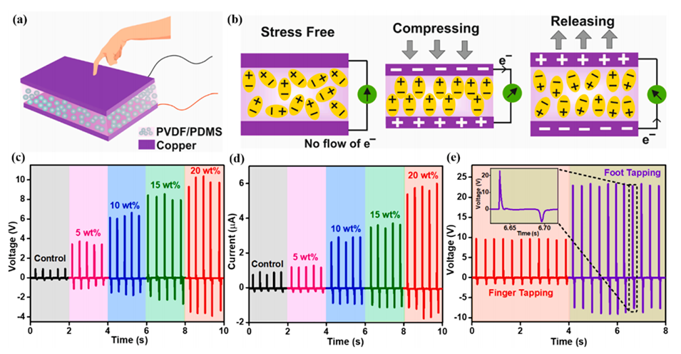 图17.(a)手指敲击运动下的压电装置和(b)不同条件下装置的工作机制的示意图,说明了电子的流动(e-)。(c)在手指敲击PDMS中掺有不同重量百分比PVDF微球的设备期间,作为输出电响应产生的开路电压(Voc)和(d)短路电流(Isc)。(e)在手指敲击和脚部敲击运动下,含有20wt%PVDF微球的PDMS基质组成的装置的开路电压(Voc);插图表示一个周期内输出电压响应的放大图。