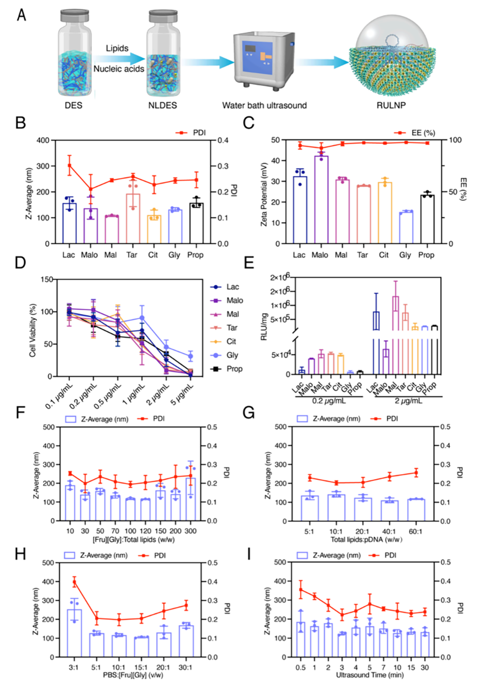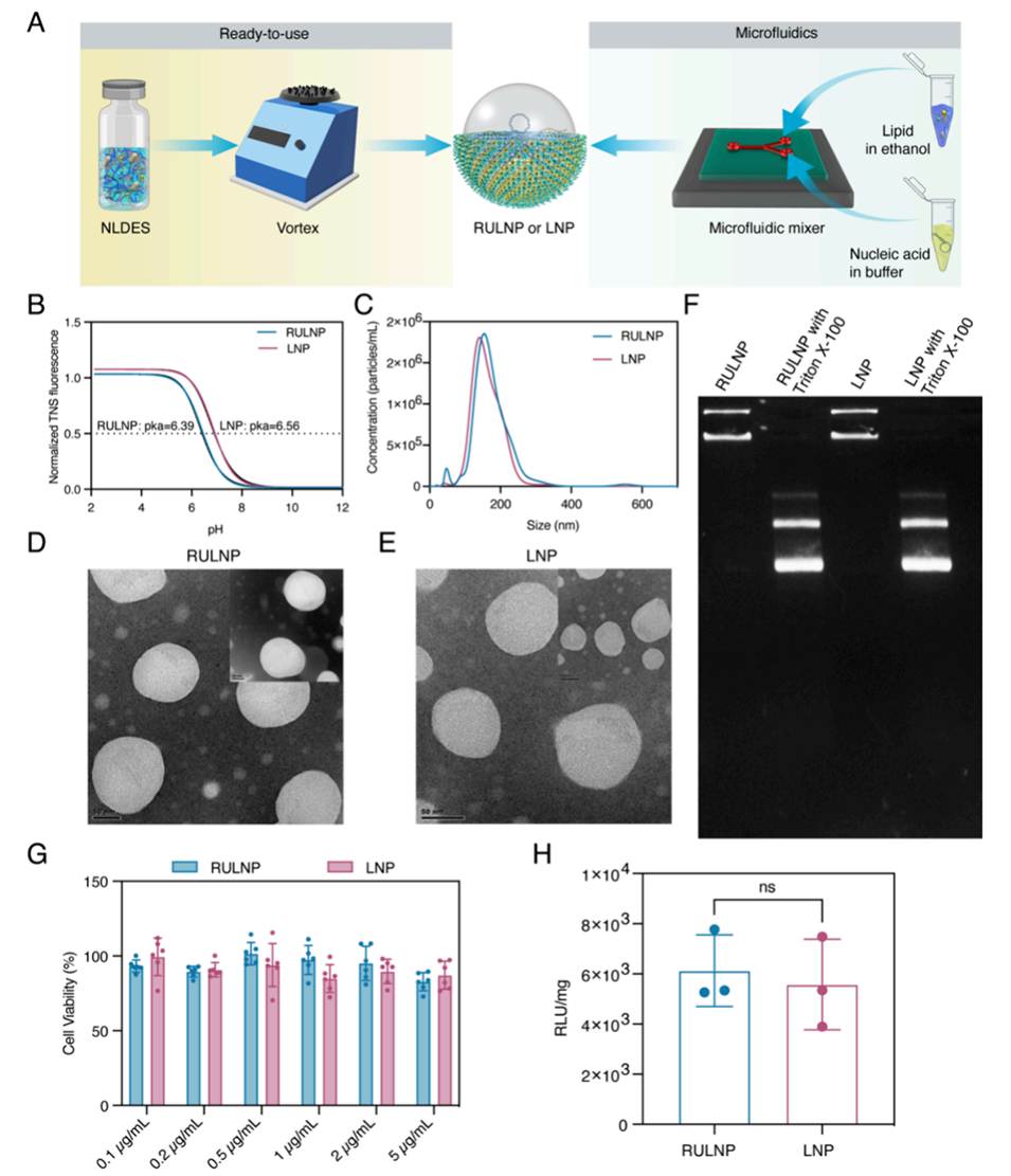 1、本研究开发了一种基于深共熔溶剂(DES)的即用型脂质纳米颗粒(RULNP)技术,用于核酸递送。
