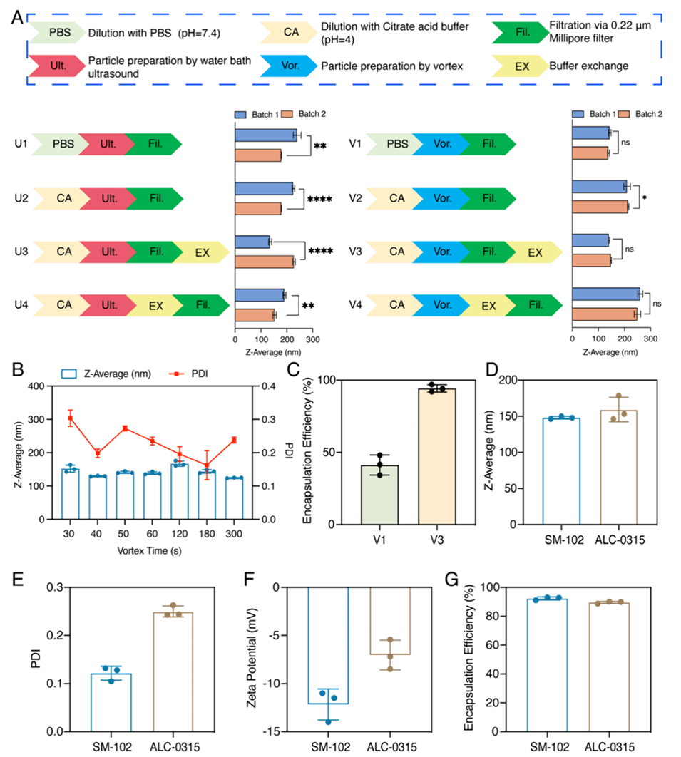 图2.负载pDNA的可电离RULNPs的工艺过程开发。