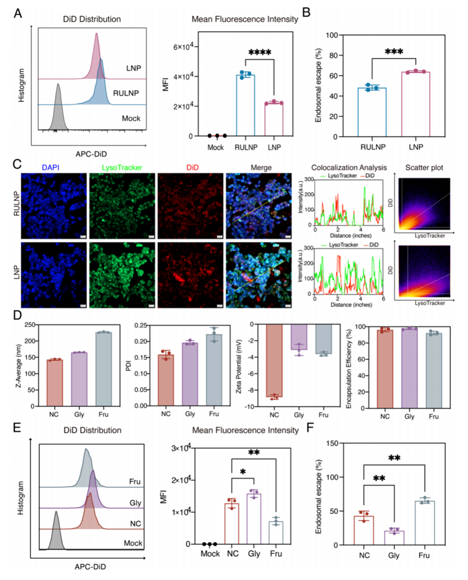 4、机制研究表明,尽管RULNP的内含体逃逸能力有限,但其细胞摄取能力优于LNP。