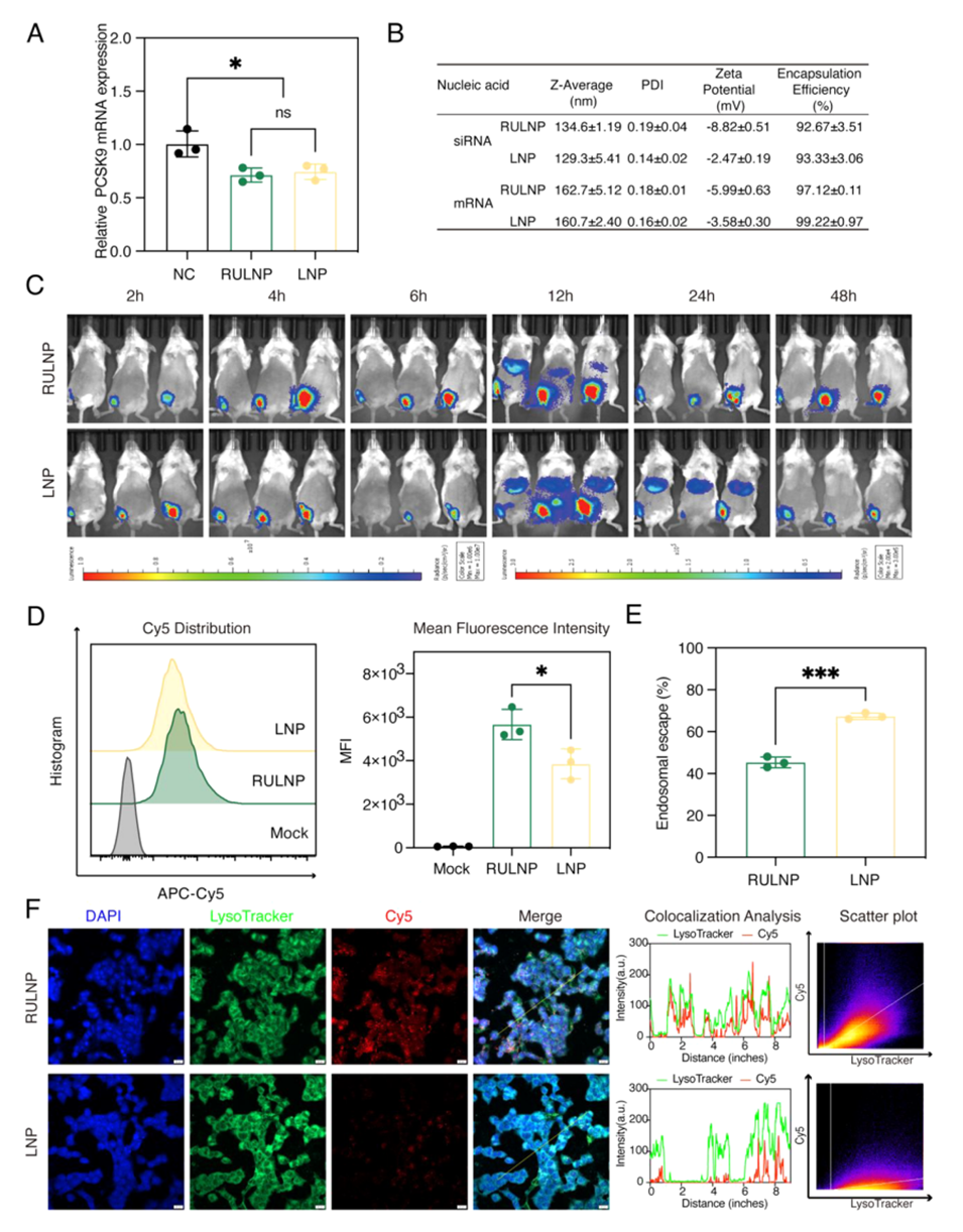 5、较好的细胞摄取能力:尽管RULNPs在内含体逃逸能力上有限,但其细胞摄取能力优于传统LNPs,确保了有效的核酸递送。